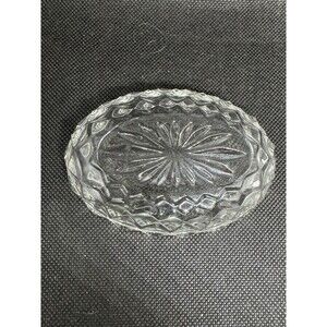 This is a charming vintage clear pressed glass oval dish with a classic starburst base and sawtooth rim. Its timeless pressed glass pattern adds sparkle and elegance to any space.