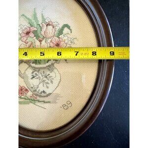 Oval Professional Framed Cross Stitch Needle Point Floral Vase Art Wood '89 Ohio