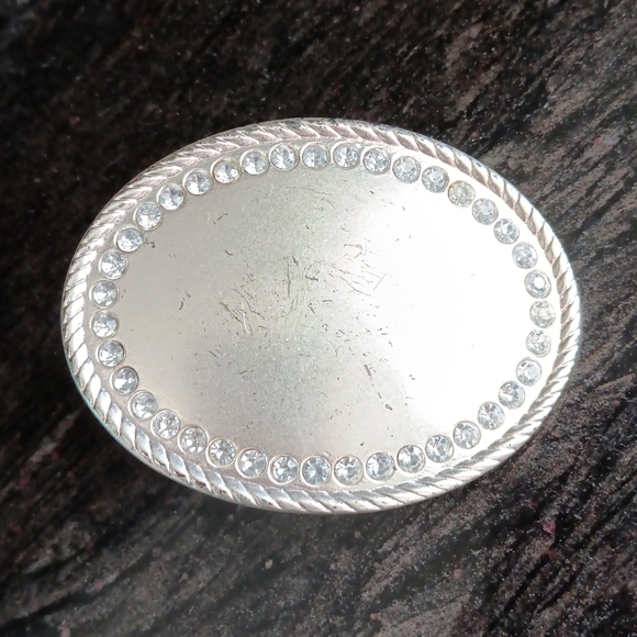 Keep it classy with this sleek oval belt buckle featuring a smooth silver-tone center framed by a sparkling rhinestone border and finished with a twisted rope edge ✨🤠 Simple, timeless, and easy to style with just about anything.