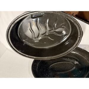 This metal oval roasting pan measures 15 1/2 inches long by 11 inches wide and 4 1/2 inches deep.