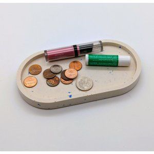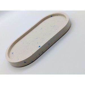 With an off-white base color, this oval shaped blue speckled trinket tray is perfect for holding your jewelry, keys, coins, or other small items and is a great addition to your home decor.