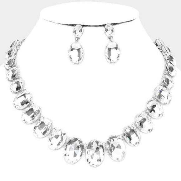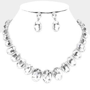 Oval Clear Crystal Link Evening Silver Necklace Set
