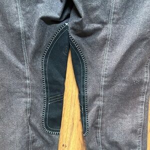 Grey with black accents. Size 28R riding pants. Some wear as seen in photos