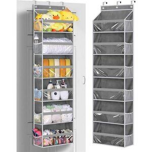 🧿【Offers Ton of Capacity】 6 big pockets and 12 mesh side pockets, longer and wider than other Over the door storage Organizer, it's able to store 130 diapers, 70 tall bottles, 60 pairs of kids shoes, etc; Overall is 5.5"D x 15.5"W x 64"H;