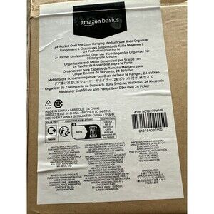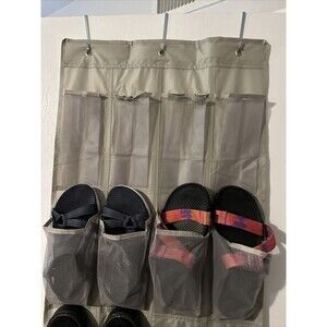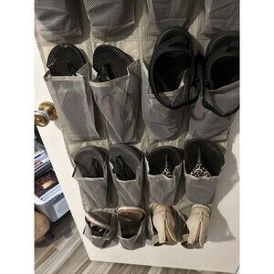 This is an Amazon Basics 24 Pocket Over The Door Shoe Holder with 3 hooks. It is designed to hang over a door and store shoes in its pockets. Please note that shoes are not included with the product.
