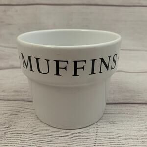 Over and Back Inc. white small crocks or bowls that say MUFFINS, BREAD, BISCUITS. Set of 2 crocks. They are pre-owned but great condition. Some wear on the very bottoms.