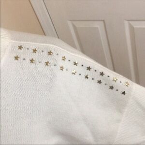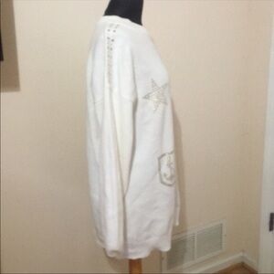 White oversized 100% cotton crew neck knit sweater embellished with gold stud stars 🌟 and anchors on front and gold stars 🌟 and clear dots on shoulders. 291/2”long 10”bust (laying flat armpit to armpit) 20” sleeve. Perfect NWOT condition.