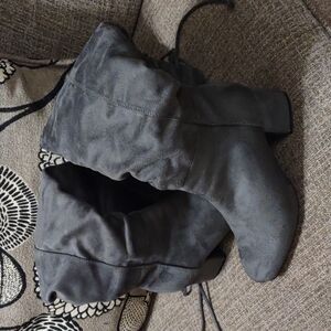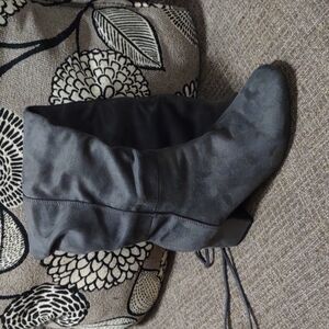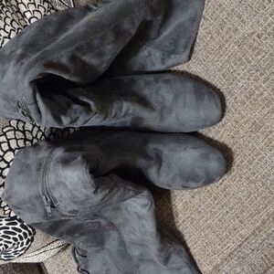 Cato gray faux suede over the knee boots. Beautiful boots. There's a tie at the top of the boot so you can adjust the boot to fit your thigh. There is a zipper on the side by the ankle to help when putting on the boots. Excellent condition. Make an offer. Remember the price is only a suggestion. Thanks for shopping 🛍️