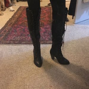 Perfect for a night out! These black over the knee boots are brand new, never been worn! They lace up in the front but also have a zipper on the interior for easy on and off.