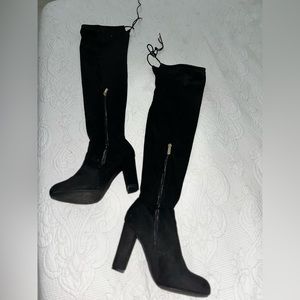 Black faux suede over the knee boots! Good for winter. They are a wide calf over the knee boots. Size is 7.5. Heel is about a 3-4 inch. Comfortable boot. It has a zipper on the side. It also has strings on the top to adjust to your liking!