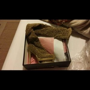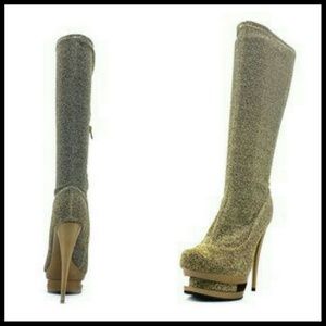 Glittery Gold boots. Over the knee. Stretchy material. Zipper inside. Pull up. 5 inch heels. 1- 1/2 inch platform. Never worn