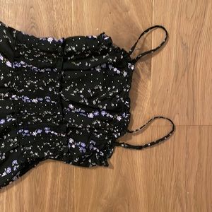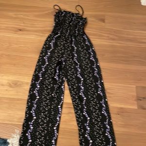 Black overall with purple flower prints. Never worn. Like new.