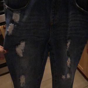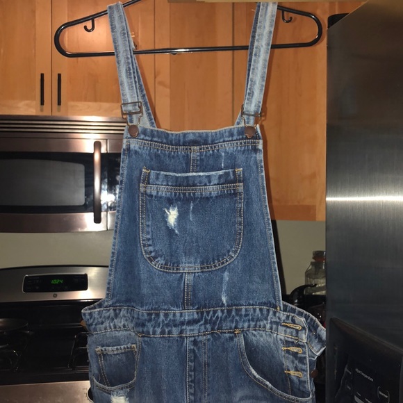 Ripped blue overalls. Button side closure