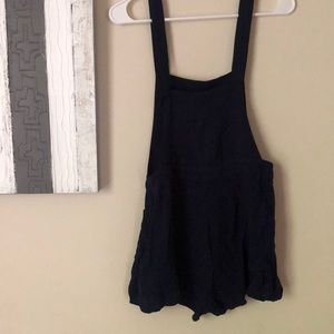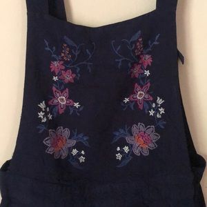Navy blue overalls from H&M. Flowery design in the front and zips on the side. Super cute with a bandeau or crop top underneath.