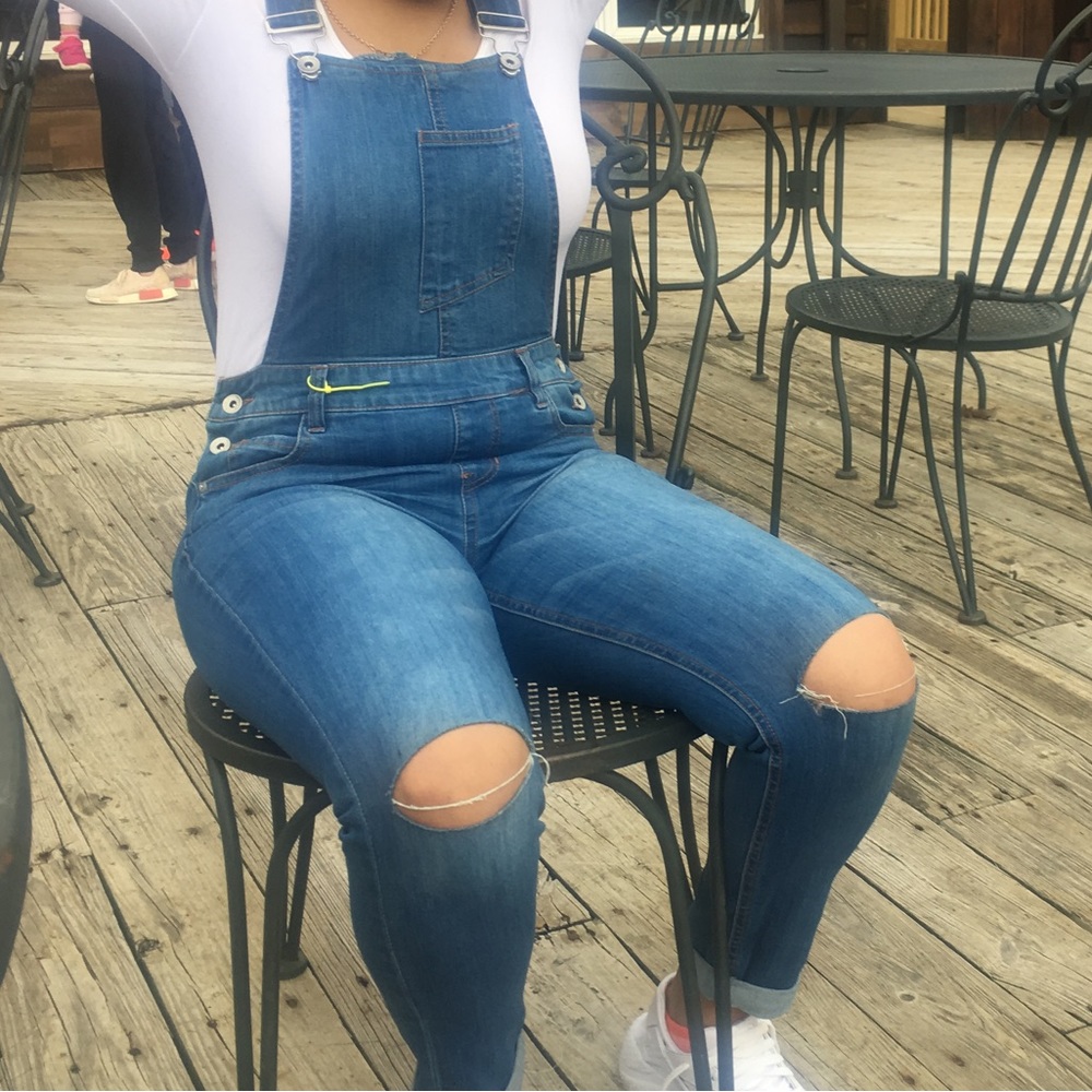 Blue Denim overall with cutout details at the knee.