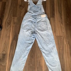 Very comfortable denim H&M brand overalls with knee rips. Light wash size women's M with silver buttons. Fairly used but still in good condition.