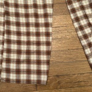 Bell bottom plaid overalls. Button fasteners. Has pockets.