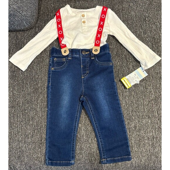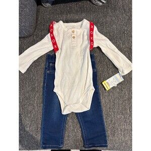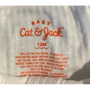 Cat & Jack overalls. The shirt has 3 snaps in the diaper area. The suspenders are attached with buttons. Size 12 months. Brand new off of a pallet. (7A)