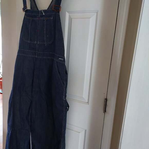 Full denim overalls. Metal buttons and snaps. Numerous pockets. Great vintage buy! Retro item ready for the "garden" look.