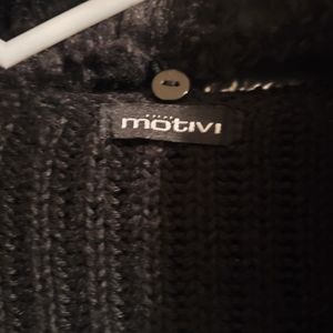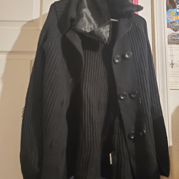 Black knitted over coat with faux fur shoulder flap.
