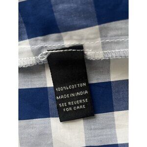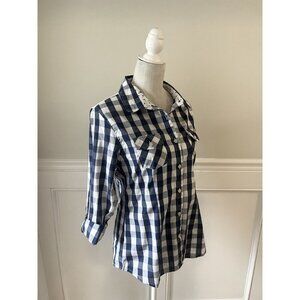Lightweight blouse by Overdrive offering a stylish blue and white gingham pattern with a delicate crochet lace yoke. Button front design and tab sleeves add versatility. Size Large. New without tags