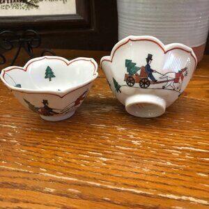 Winter Scene hand-painted bowls with scalloped edges featuring a Christmas scene.