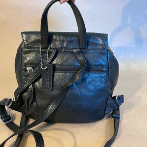 Overland Black Genuine Leather Drawstring Flap Magnetic Close Backpack RFID