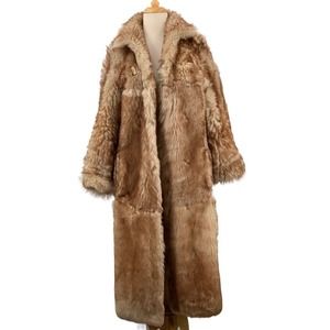 This is a beautiful Overland Spanish Lambskin Shearling Women's Long Reversible Rancher Coat soft tan/brown lambskin pieced panels outer w/mixed brown/beige inner fur lining in a Size 40 XS/S, made in Spain. DD