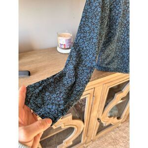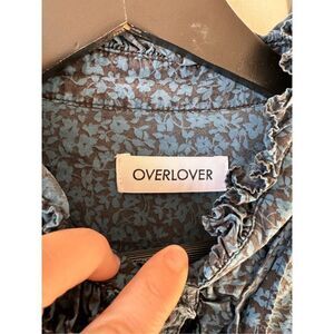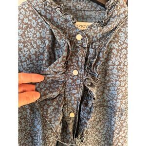 Overlover Blue Button Down Ruffled Trim Long Sleeve Blouse Pearl Buttons Women’s