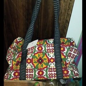 Spanish/mexican inspired overnight bag. Multi colored floral style printed. Red, white, green, tan, and orange.