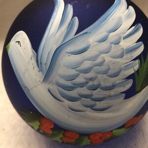 Here is a beautiful Oversized hand painted Christmas ornament with a dove of peace, It measures 4 1/2 inches tall with a circumference of 12 1/2 inches. I have been collecting Christmas ornaments both Martin and vintage the years and it’s time to start downsizing my collection