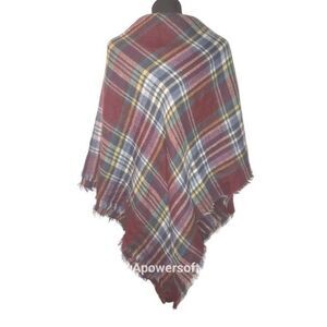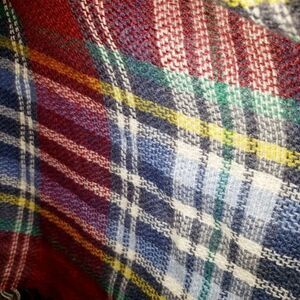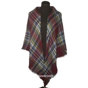 Great preloved condition without flaws. Red,yellow,blue and white large scale plaid pattern on a square oversized fringe trim blanket scarf. There are no tags so I do not know the brand or fabric content