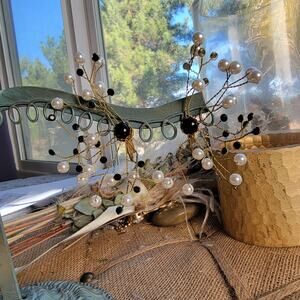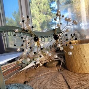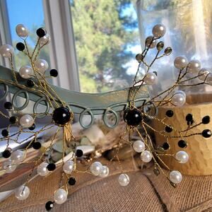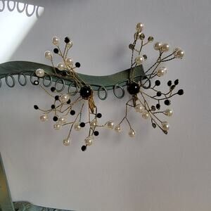 Dare to be bold with these stunning 3-inch pearl and black bead clip-on earrings. Designed with delicate wire branches adorned with faux pearls and black beads, these oversized earrings are a true vintage statement piece.