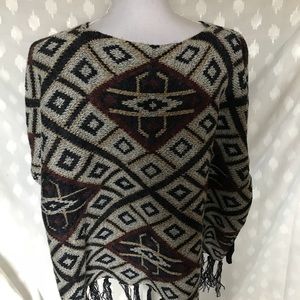 Acrylic/Nylon/ poly mix Approx 31.5 underarm W and approx 23" L not including fringe. Fringe approx 6". Sweater is so soft