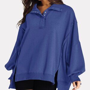 This oversized blue pullover is designed for a relaxed, comfortable fit, featuring a snap button collar for versatile styling. Its casual yet chic design makes it an excellent choice for those seeking comfort without compromising on style. Suitable for various activities, it offers both ease and a fashion-forward look.