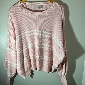 Elevate your cozy-chic style with this lovely oversized pullover sweater from Sincerely Jules, size Medium Crafted from soft, breathable 100% cotton, this sweater features a beautiful blush pink colorway accented with crisp white horizontal stripes. It has a relaxed, dropped-shoulder dolman sleeve cut and a wide-ribbed knit construction for a comfortable, slightly slouchy fit. The ribbed crew neck, cuffs, and hem add a classic finish. This versatile piece is perfect for a relaxed yet stylish look across multiple seasons.