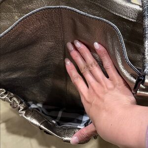 Stylish Burberry shoulder bag in metallic gold. Features elegant design and durable straps. Spacious and practical, as well. Good for students or professionals to hold ipads/laptops or busy moms to hold baby supplies