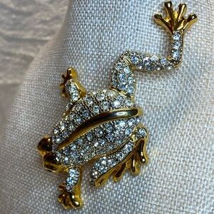 This very large brooch features a three dimensional, textured silver tone frog or toad. Its hands, feet, head, and spine are glossy gold tone metal. Its body is encrusted with dazzling clear rhinestones, and it has two glittering emerald green rhinestone eyes. This statement brooch is on the heavier side and would best be worn on a stiffer fabric or jacket. These pictures don't do justice to how much this pin sparkles!