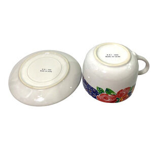 Oversized Cup & Saucer Floral Ceramic GGI 1996 On Bottom...good vintage condition...no chips or cracks...some wear on bottom rims from use-see photos...cup measures about 3.5" tall with top diameter about 4.5"...saucer is about 7" in diameter...would look pretty sitting on shelf as home decor.