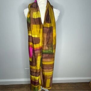 Vibrant wrap/ shawl with pink, yellow, green and brown color blocking.