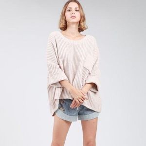 3/4 Sleeve wide neck oversized chenille pullover with front pocket and roll up sleeves.