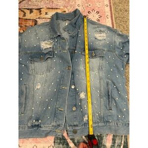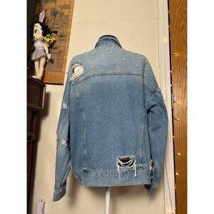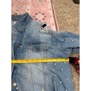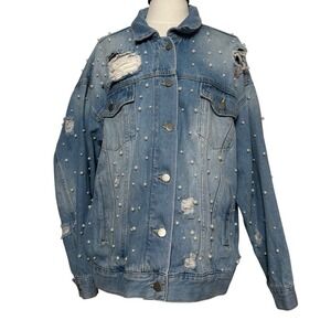 Keywords: denim jacket, pearls, rhinestones, distressed, embroidered, bling, studded, statement piece, designer, fashion, outerwear, light wash, rock and roll, trucker jacket