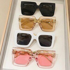 The lenses are tinted, offering both UV protection and a touch of mystery to your ensemble. Gold-toned chain link temple arms enhance the luxurious feel, adding a unique and trendy twist to the classic design.