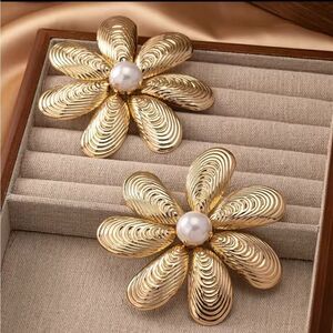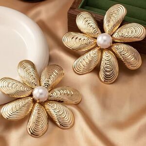 Make a bold statement with these stunning oversized floral earrings. Crafted in a beautiful gold-tone finish, these earrings feature intricately layered petals and are completed with a lustrous pearl at the center, evoking a modern yet timeless elegance. Perfect for adding a dramatic flair to any outfit.