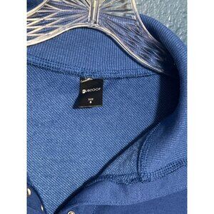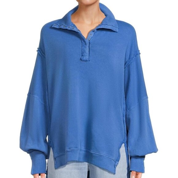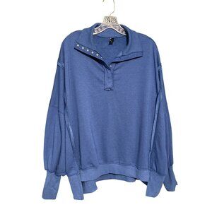 This oversized blue pullover is designed for a relaxed, comfortable fit, featuring a snap button collar for versatile styling. Its casual yet chic design makes it an excellent choice for those seeking comfort without compromising on style. Suitable for various activities, it offers both ease and a fashion-forward look.