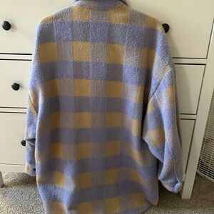 Stylish oversized plaid jacket featuring a purple and tan checkered pattern. Perfect for layering.