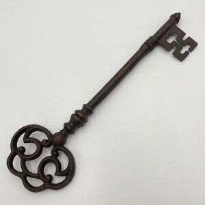Large rustic key to hang on the wall or display on a shelf. No material information, but feels like lightweight metal.