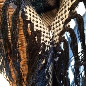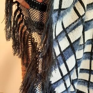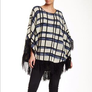 Oversized Poncho Boho Checked Plaid Windowpane Eyelash Fringe Trim Black Size M