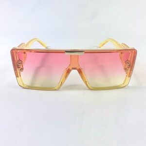 These sunglasses feature a bold, oversized design with a rectangular frame. The frame is transparent with a slight tint, offering a modern and sleek appearance. The lenses are gradient, transitioning from a dark tint at the top to a lighter hue at the bottom, providing a stylish contrast. A thin metallic gold accent decorates the top of the frame, adding a touch of elegance. The temples are also transparent with a dark tint, maintaining the cohesive design. These sunglasses are perfect for making a fashion statement while offering protection from the sun.