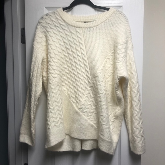 Soft and comfortable oversized sweater with varying ribbed patterns. It’s a very light cream/white color and has never been worn.